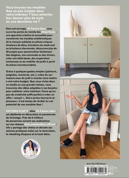 Dans cet ouvrage, VK Passion Déco vous ouvre les portes du monde des #Ikea Hacks : une approche créative et accessible pour transformer les meubles emblématiques de la marque suédoise en pièces uniques. Amateurs de déco, bricoleurs du week-end ou bricoleurs chevronnés, découvrez plus de 30 projets pour personnaliser facilement des étagères, une commode ou des miroirs, créer une table basse, des suspensions lumineuses ou du mobilier de jardin à partir de pièces incontournables. Grâce à quelques gestes simples (peinture, poignées, moulures, etc.), créez du surmesure avec du prêt-à-monter sans mettre à mal votre budget. Que vous viviez dans un studio ou une grande maison, vous trouverez des idées adaptées à vos besoins pour sublimer votre intérieur. Parce qu’un peu de créativité suffit parfois à créer un effet « waouh ». Alors sortez tournevis et pinceaux : il est temps de révéler le vrai potentiel de vos meubles Ikea ! VICTORIA FLOC’H, alias VK Passion Déco, est diplômée en décoration et passionnée de bricolage. Près de 6 millions de personnes suivent ses réalisations sur ses réseaux @vk_passiondeco_officiel : elle y partage des vidéos et dévoile ses astuces pratiques axées sur la rénovation, le relooking d’espace et le hack déco.
