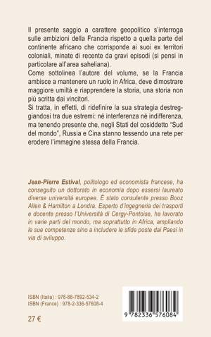 Il presente saggio a carattere geopolitico s'interroga sulle ambizioni della Francia rispetto a quella parte del continente africano che corrisponde ai suoi ex territori coloniali, minate di recente da gravi episodi (si pensi in particolare all'area saheliana).