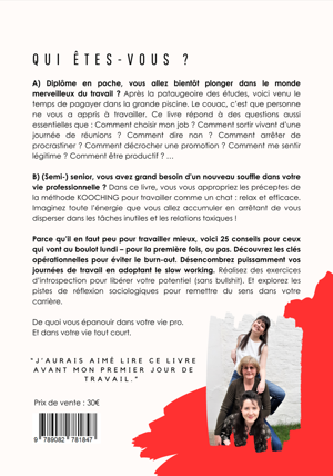 A) Diplôme en poche, vous allez bientôt plonger dans le monde merveilleux du travail? Après la pataugeoire des études, voici venu le temps de pagayer dans la grande piscine. Le couac, c’est que personne ne vous a appris à travailler. Ce livre répond à des questions aussi essentielles que: Comment choisir mon job? Comment sortir vivant d’une journée de réunions? Comment dire non? Comment arrêter de procrastiner? Comment décrocher une promotion? Comment me sentir légitime? Comment être productif? …