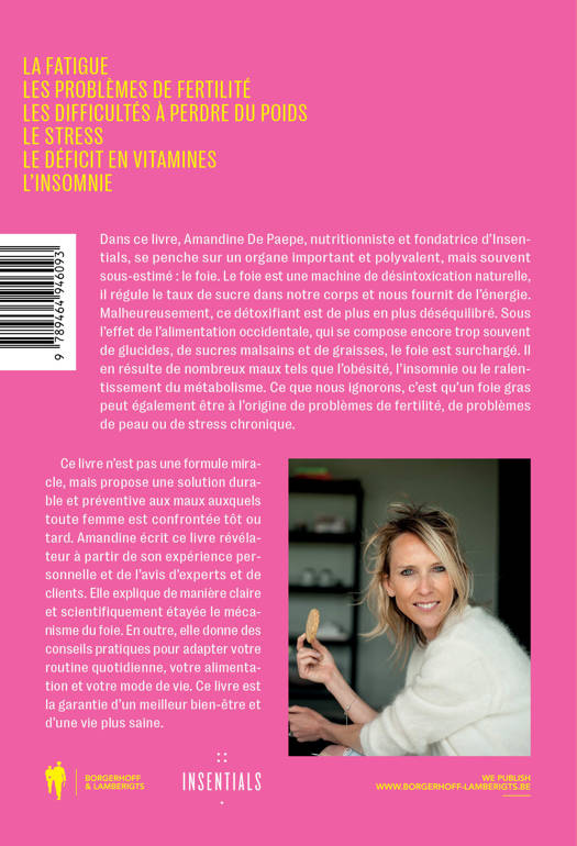 Dans ce livre, Amandine De Paepe, nutritionniste et fondatrice d’Insentials, se penche sur un organe important et polyvalent, mais souvent sous-estimé : le foie. Le foie est une machine de désintoxication naturelle, il régule le taux de sucre dans notre corps et nous fournit de l’énergie. Malheureusement, ce détoxifiant est de plus en plus déséquilibré. Sous l’effet de l’alimentation occidentale, qui se compose encore trop souvent de glucides, de sucres malsains et de graisses, le foie est surchargé. Il en résulte de nombreux maux tels que l’obésité, l’insomnie ou le ralentissement du métabolisme. Ce que nous ignorons, c’est qu’un foie gras peut également être à l’origine de problèmes de fertilité, de problèmes de peau ou de stress chronique. Ce livre n’est pas une formule miracle, mais propose une solution durable et préventive aux maux auxquels toute femme est confrontée tôt ou tard. Amandine écrit ce livre révélateur à partir de son expérience personnelle et de l’avis d’experts et de clients. Elle explique de manière claire et scientifiquement étayée le mécanisme du foie. En outre, elle donne des conseils pratiques pour adapter votre routine quotidienne, votre alimentation et votre mode de vie. Ce livre est la garantie d’un meilleur bien-être et d’une vie plus saine.