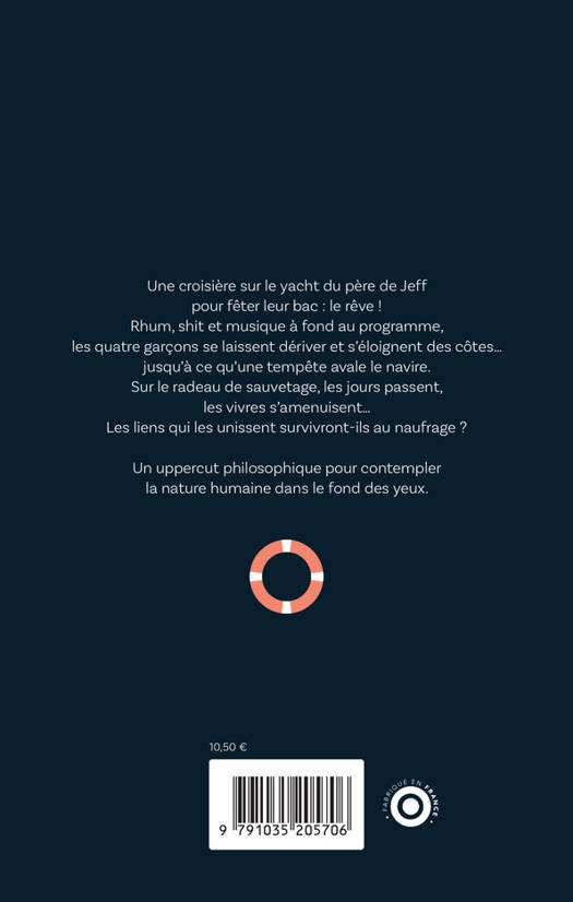 Une croisière sur le yacht du père de Jeff pour fêter leur bac : le rêve ! Rhum, shit et musique à fond au programme, les quatre garçons se laissent dériver et s'éloignent des côtes... jusqu'à ce qu'une tempête avale le navire. Sur le radeau de sauvetage, les jours passent, les vivres s'amenuisent... Les liens qui les unissent survivront-ils au naufrage ? Un uppercut philosophique pour contempler la nature humaine dans le fond des yeux.