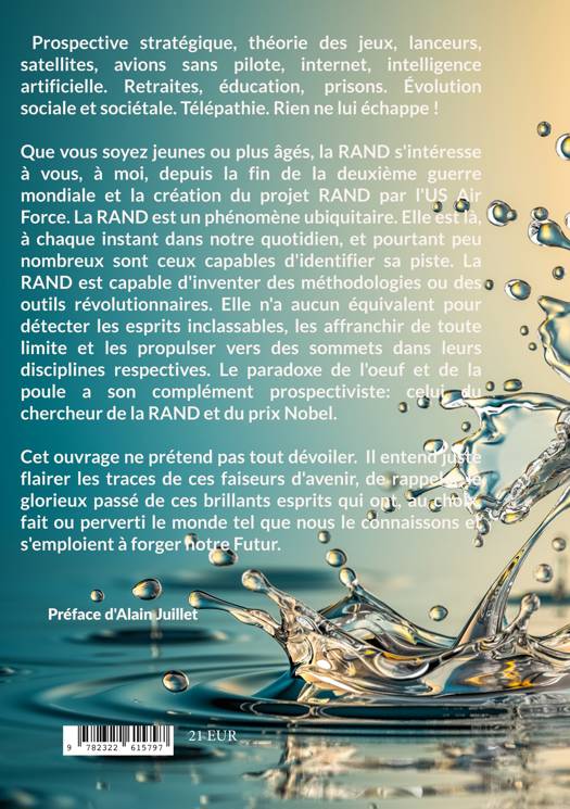Que vous soyez jeunes ou plus âgés, la RAND s'intéresse à vous, à moi, depuis la fin de la deuxième guerre mondiale et la création du projet RAND par l'US Air Force. La RAND est un phénomène ubiquitaire. Elle est là, à chaque instant dans notre quotidien, et pourtant peu nombreux sont ceux capables d'identifier sa piste. La RAND est capable d'inventer des méthodologies ou des outils révolutionnaires. Elle n'a aucun équivalent pour détecter les esprits inclassables, les affranchir de toute limite et les propulser vers des sommets dans leurs disciplines respectives. Le paradoxe de l'oeuf et de la poule a son complément prospectiviste: celui du chercheur de la RAND et du prix Nobel. Cet ouvrage ne prétend pas tout dévoiler. Il entend juste flairer les traces de ces faiseurs d'avenir, de rappeler le glorieux passé de ces brillants esprits qui ont, au choix, fait ou perverti le monde tel que nous le connaissons et s'emploient à forger notre Futur.