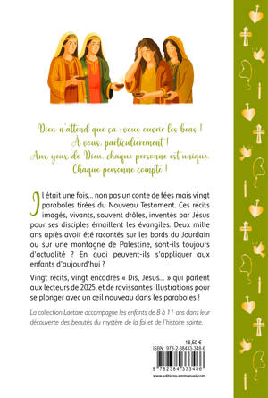 Il était une fois... non pas un conte de fées mais vingt paraboles tirées du Nouveau Testament. Ces récits imagés, vivants, souvent drôles, racontés par Jésus à ses disciples émaillent les évangiles. Deux mille ans après avoir été racontés sur les bords du Jourdain ou sur une montagne de Palestine, sont-ils toujours d'actualité ? En quoi peuvent-ils s'appliquer aux enfants d'aujourd'hui ? Vingt récits, vingt encadrés "Dis, Jésus..." qui parlent aux lecteurs de 2025, et de ravissantes illustrations pour se plonger avec un oeil nouveau dans les paraboles ! La collection Laetare accompagne les enfants de 8 à 11 ans dans leur découverte des beautés du mystère de la foi et de l’histoire sainte.