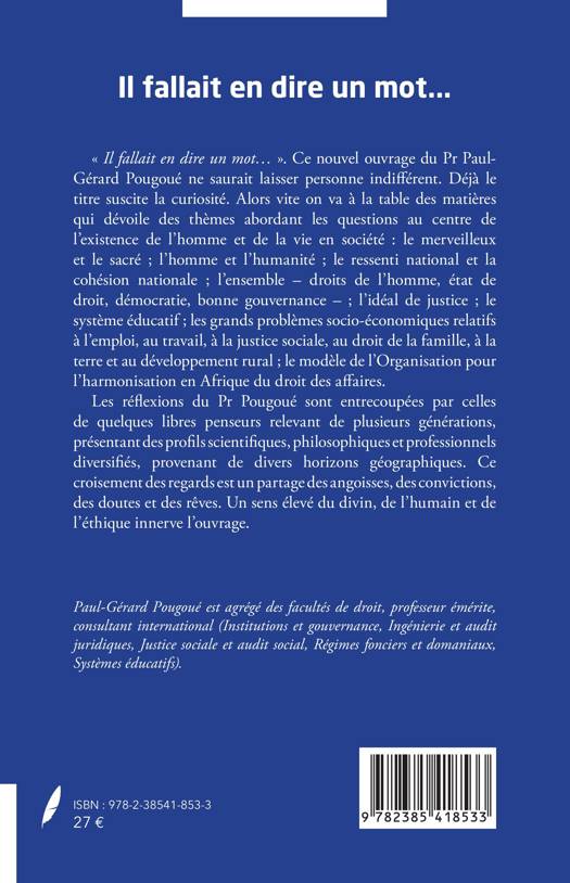 Il fallait en dire un mot... . Ce nouvel ouvrage du Pr Paul-Gérard Pougoué ne saurait laisser personne indifférent. Déjà le titre suscite la curiosité. Alors vite on va à la table des matières qui dévoile des thèmes abordant les questions au centre de l'existence de l'homme et de la vie en société le merveilleux et le sacré; l'homme et l'humanité; le ressenti national et la cohésion nationale; l'ensemble - droits de l'homme, état de droit, démocratie, bonne gouvernance -; l'idéal de justice; le système éducatif; les grands problèmes socio-économiques relatifs à l'emploi, au travail, à la justice sociale, au droit de la famille, à la terre et au développement rural; le modèle de l'Organisation pour l'harmonisation en Afrique du droit des affaires. Les réflexions du Pr Pougoué sont entrecoupées par celles de quelques libres penseurs relevant de plusieurs générations, présentant des profils scientifiques, philosophiques et professionnels diversifiés, provenant de divers horizons géographiques. Ce croisement des regards est un partage des angoisses, des convictions, des doutes et des rêves. Un sens élevé du divin, de l'humain et de l'éthique innerve l'ouvrage.