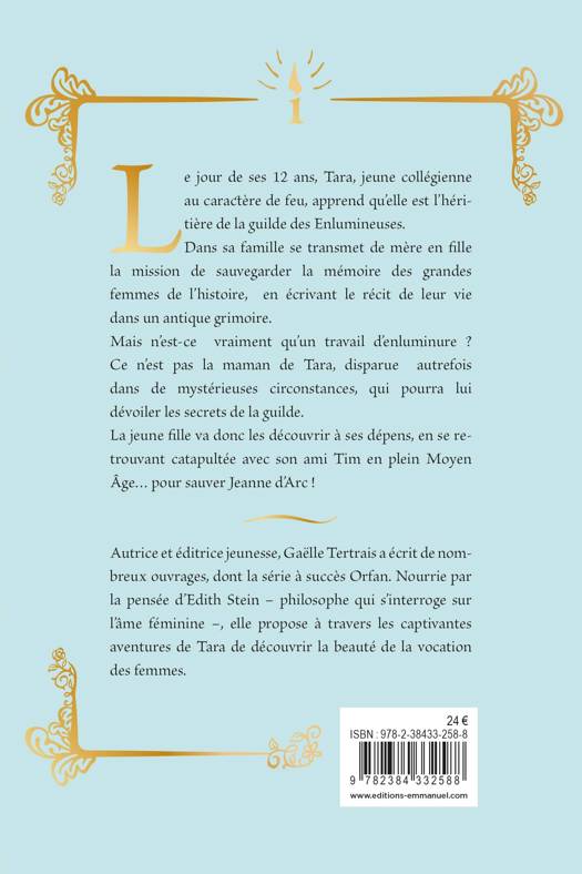 Le jour de ses 12 ans, Tara, jeune collégienne au caractère de feu, apprend qu’elle est l’héritière de la Guilde des Enlumineuses. Dans sa famille se transmet de mère en fille la mission de sauvegarder la mémoire des grandes femmes de l’histoire, en écrivant le récit de leur vie dans un antique grimoire. Mais n’est-ce vraiment qu’un travail d’enluminure ? Ce n’est pas la maman de Tara, disparue autrefois dans de mystérieuses circonstances, qui pourra lui dévoiler les secrets de la Guilde. Tara va donc les découvrir à ses dépens, en se retrouvant catapultée avec son ami Tim en plein Moyen Âge… pour sauver Jeanne d’Arc !