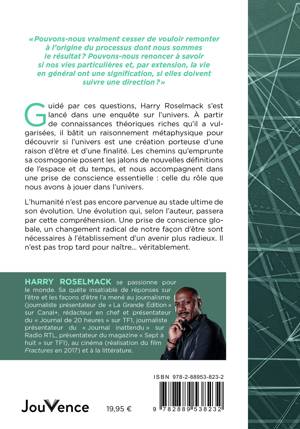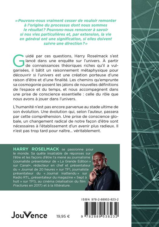 Guidé par ces questions, Harry Roselmack s’est lancé dans une enquête sur l’univers. À partir de connaissances théoriques riches qu'il a vulgarisées, il bâtit un raisonnement métaphysique pour découvrir si l’univers est une création porteuse d’une raison d’être et d’une finalité. Les chemins qu’emprunte sa cosmogonie posent les jalons de nouvelles définitions de l’espace et du temps et nous accompagnent dans une prise de conscience essentielle : celle du rôle que nous avons à jouer dans l’univers. L’humanité n’est pas encore parvenue au stade ultime de son évolution. Une évolution qui, selon l’auteur, passera par cette compréhension. Une prise de conscience globale, un changement radical de notre façon d'être sont nécessaires à l'établissement d'un avenir plus radieux. Il n’est pas trop tard pour naître... véritablement.