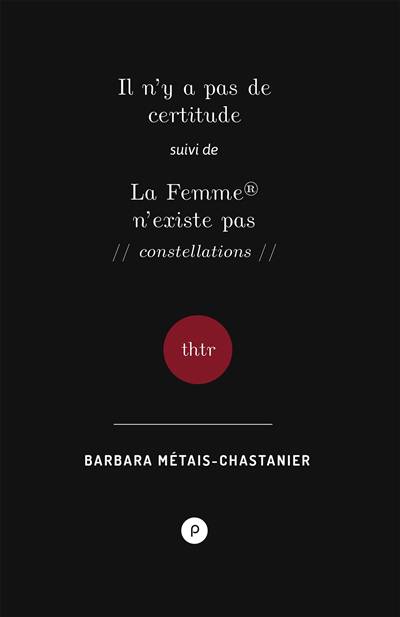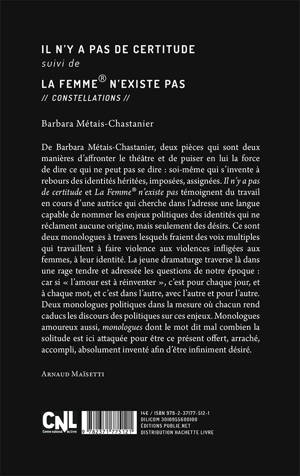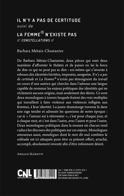 De Barbara Métais-Chastanier, deux pièces qui sont deux manières d’affronter le théâtre et de puiser en lui la force de dire ce qui ne peut pas se dire : soi-même qui s’invente à rebours des identités héritées, imposées, assignées. Il n’y a pas de certitude et La Femme® n’existe pas témoignent du travail en cours d’une autrice qui cherche dans l’adresse une langue capable de nommer les enjeux politiques des identités qui ne réclament aucune origine, mais seulement des désirs. Ce sont deux monologues à travers lesquels fraient des voix multiples qui travaillent à faire violence aux violences infligées aux femmes, à leur identité. La jeune dramaturge traverse là dans une rage tendre et adressée les questions de notre époque : car si « l’amour est à réinventer », c’est pour chaque jour, et à chaque mot, et c’est dans l’autre, avec l’autre et pour l’autre. Deux monologues politiques dans la mesure où chacun rend caducs les discours des politiques sur ces enjeux. Monologues amoureux aussi, monologues dont le mot dit mal combien la solitude est ici attaquée pour être ce présent offert, arraché, accompli, absolument inventé afin d’être infiniment désiré. Arnaud Maïsetti