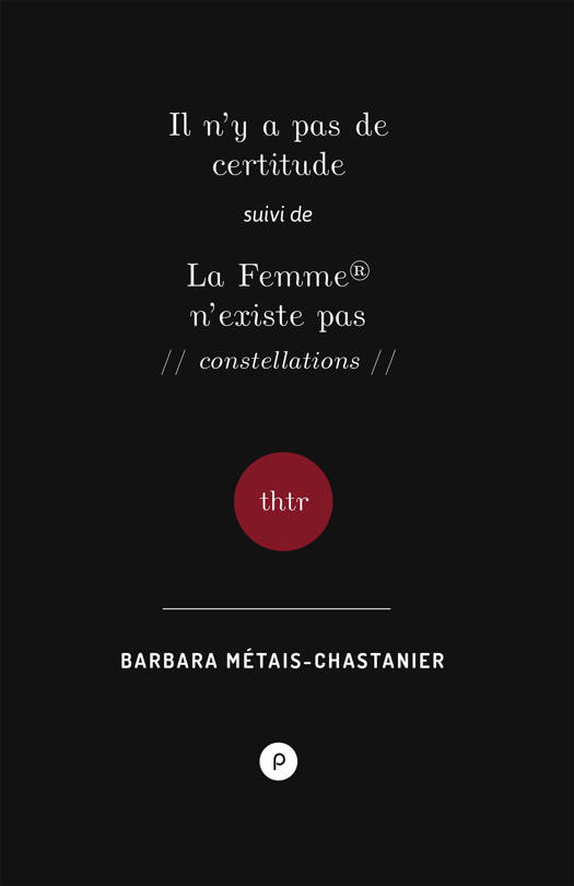 De Barbara Métais-Chastanier, deux pièces qui sont deux manières d’affronter le théâtre et de puiser en lui la force de dire ce qui ne peut pas se dire : soi-même qui s’invente à rebours des identités héritées, imposées, assignées. Il n’y a pas de certitude et La Femme® n’existe pas témoignent du travail en cours d’une autrice qui cherche dans l’adresse une langue capable de nommer les enjeux politiques des identités qui ne réclament aucune origine, mais seulement des désirs. Ce sont deux monologues à travers lesquels fraient des voix multiples qui travaillent à faire violence aux violences infligées aux femmes, à leur identité. La jeune dramaturge traverse là dans une rage tendre et adressée les questions de notre époque : car si « l’amour est à réinventer », c’est pour chaque jour, et à chaque mot, et c’est dans l’autre, avec l’autre et pour l’autre. Deux monologues politiques dans la mesure où chacun rend caducs les discours des politiques sur ces enjeux. Monologues amoureux aussi, monologues dont le mot dit mal combien la solitude est ici attaquée pour être ce présent offert, arraché, accompli, absolument inventé afin d’être infiniment désiré. Arnaud Maïsetti