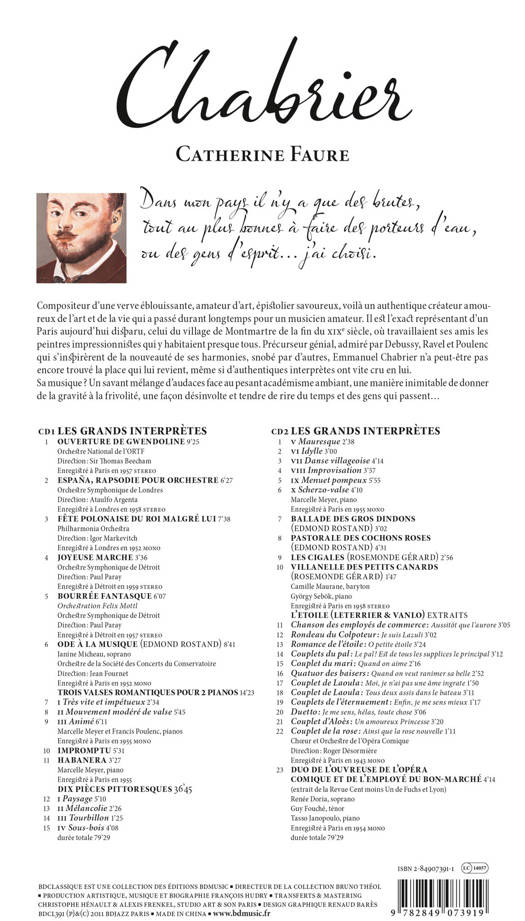 La biographie d'Emmanuel Chabrier , écrite par François Hudry, illustrée par Catherine Faure, accompagnée de 2 compacts discs. Emmanuel Chabrier (1841-1894)<br /><br /> "Dans mon pays il n'y a que des brutes, <br /> tout au plus bonnes à faire des porteurs d'eau, <br /> ou des gens d'esprit... j'ai choisi."<br /><br /> Emmanuel Chabrier<br /><br /> Compositeur d’une verve éblouissante, amateur d’art, épistolier savoureux, voilà un authentique créateur amoureux de l’art et de la vie qui a passé durant longtemps pour un musicien amateur. Il est l'exact représentant d'un Paris aujourd'hui disparu, celui du village de Montmartre de la fin du XIXe siècle, où travaillaient ses amis les peintres impressionnistes qui y habitaient presque tous. Précurseur génial, admiré par Debussy, Ravel et Poulenc qui s’inspirèrent de la nouveauté de ses harmonies, snobé par d'autres, Emmanuel Chabrier n'a peut-être pas encore trouvé la place qui lui revient, même si d'authentiques interprètes ont vite cru en lui. <br /><br /> Sa musique ? Un savant mélange d'audaces face au pesant académisme ambiant, une manière inimitable de donner de la gravité à la frivolité, une façon désinvolte et tendre de rire du temps et des gens qui passent...<br />