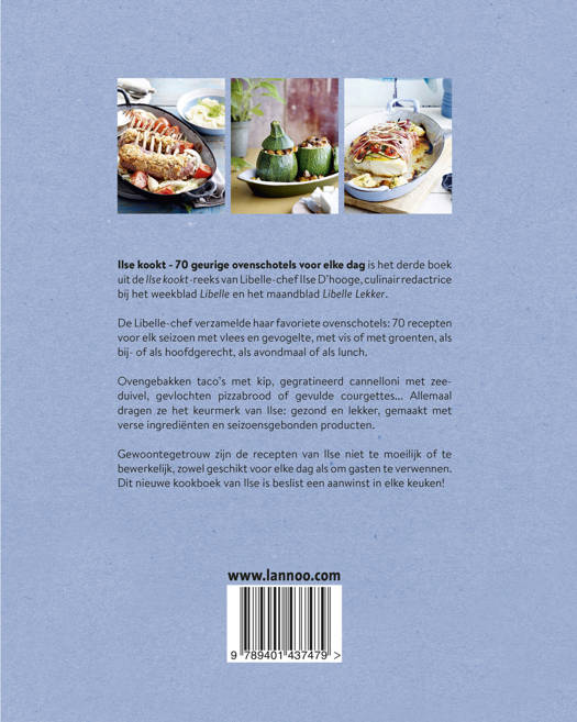 Heerlijke ovenschotels van Libelle-chef Ilse Ilse kookt - 70 geurige ovenschotels voor elke dag is het derde boek uit de Ilse kookt-reeks van Libelle-chef Ilse D'hooge, culinair redactrice bij het weekblad Libelle en het maandblad Libelle Lekker. De Libelle-chef verzamelde haar favoriete ovenschotels: 70 recepten voor elk seizoen met vlees en gevogelte, met vis of met groenten, als bij- of als hoofdgerecht, als avondmaal of als lunch. Ovengebakken taco's met kip, gegratineerde cannelloni met zeeduivel, gevlochten pizzabrood of gevulde courgettes... Allemaal dragen ze het keurmerk van Ilse: gezond en lekker, gemaakt met verse ingrediënten en seizoensgebonden producten. Gewoontegetrouw zijn de recepten van Ilse niet te moeilijk of te bewerkelijk, zowel geschikt voor elke dag als om gasten te verwennen. Dit nieuwe kookboek van Ilse is beslist een aanwinst in elke keuken!