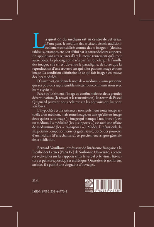 La question du medium est au centre de cet essai. D'une part, le medium des artefacts visuels traditionnellement consideres comme des images (dessins, tableaux, estampes, etc.) est defini par la nature de leurs supports. En appliquant aux oeuvres d'art le meme traitement qu'a tout autre objet, la photographie n'a pas fait qu'elargir la famille des images, elle en est devenue le paradigme, de sorte que la reproduction d'une oeuvre d'art qui n'est pas une image est une image. La condition definitoire de ce qui fait image s'en trouve des lors modifiee. D'autre part, on donne le nom de medium a une personne que ses pouvoirs suprasensibles mettent en communication avec les esprits. Parce qu'ils situent l'image au confluent de ces deux grandes determinations (le renvoi et la transmission), les textes de Pascal Quignard peuvent nous eclairer sur les pouvoirs qui lui sont attribues. L'hypothese est la suivante: non seulement toute image actuelle a un medium, mais toute image, en tant qu'elle est image de ce qui est sans image (image qui manque a nos jours), est un medium. La medialite (les supports) est aussi une affaire de mediumnite (les transports). Medee, l'infanticide, la magicienne, empoisonneuse et guerisseuse, dotee des pouvoirs d'un medium (d'une chamane), est precisement la figure generale de la mediation.