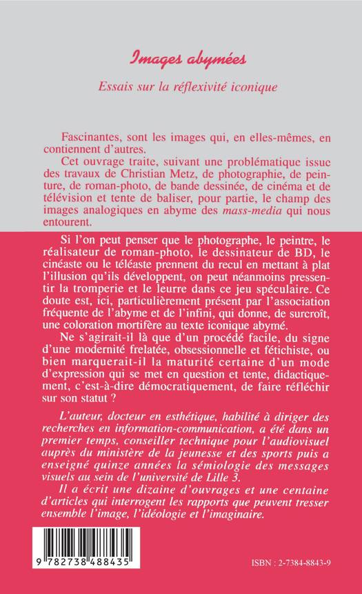 Fascinantes, sont les images qui, en elles-mêmes, en contiennent d'autres. Cet ouvrage traite, suivant une problématique issue des travaux de Christian Metz, de photographie, de peinture, de roman-photo, de bande dessinée, de cinéma et de télévision et tente de baliser, pour partie, le champ des images analogiques en abyme des mass-media qui nous entourent.