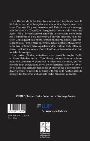 Les thèmes de la hantise, du spectral sont insistants dans la littérature narrative française contemporaine depuis une trentaine d'années. S'il y eut, en référence à l'histoire et au « message noir des camps » (Cayrol), un imaginaire spectral de la littérature après 1945 ; l'investissement actuel de la spectralité ne se limite pas à l'implication de la référence à l'univers lazaréen, ni à l'histoire. Convoquant volontiers l'image photographique et cinématographique, l'imaginaire spectral se réfère également avec insistance aux fantômes privés qui demandent asile au texte littéraire, permettant ainsi le retour d'un refoulé aussi bien individuel que social et historique.