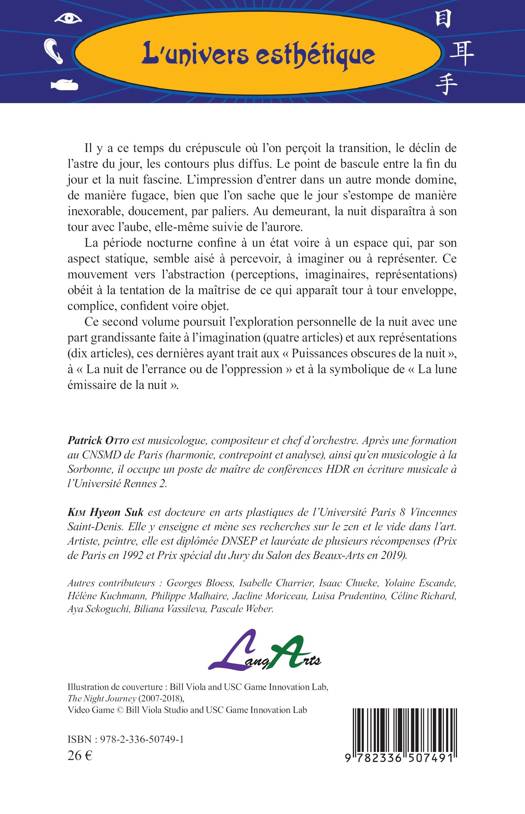 Il y a ce temps du crépuscule où l'on perçoit la transition, le déclin de l'astre du jour, les contours plus diffus. Le point de bascule entre la fin du jour et la nuit fascine. L'impression d'entrer dans un autre monde domine, de manière fugace, bien que l'on sache que le jour s'estompe de manière inexorable, doucement, par paliers. Au demeurant, la nuit disparaîtra à son tour avec l'aube, elle-même suivie de l'aurore. La période nocturne confine à un état voire à un espace qui, par son aspect statique, semble aisé à percevoir, à imaginer ou à représenter. Ce mouvement vers l'abstraction (perceptions, imaginaires, représentations) obéit à la tentation de la maîtrise de ce qui apparaît tour à tour enveloppe, complice, confident voire objet. Ce second volume poursuit l'exploration personnelle de la nuit avec une part grandissante faite à l'imagination (quatre articles) et aux représentations (dix articles), ces dernières ayant trait aux Puissances obscures de la nuit, à La nuit de l'errance ou de l'oppression et à la symbolique de La lune émissaire de la nuit .