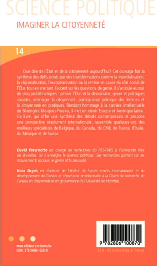 Que dire de l'État et de la citoyenneté aujourd'hui ? Cet ouvrage fait la synthèse des défis contemporains et les met en rapport avec les questions de genre. Il s'articule autour de cinq problématiques : penser l'État et la démocratie, genre et politiques sociales, interroger la citoyenneté, participation politique des femmes et la citoyenneté en pratiques. Rendant hommage à Bérengère Marques-Pereira, il rassemble quelques-uns des meilleurs spécialistes internationaux.