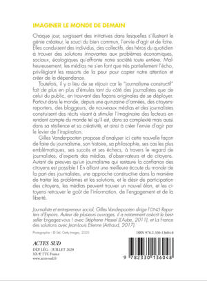 Gilles Vanderpooten propose d'analyser ici cette nouvelle façon de faire du journalisme, son histoire, sa philosophie, ses cas les plus emblématiques, ses succès et ses échecs, à travers le regard de journalistes, d'experts des médias, d'observateurs et de citoyens. Autant de preuves qu'un journalisme qui restaure la confiance des citoyens est possible ! En alliant une meilleure écoute du monde de la part des journalistes, une approche constructive dans la manière de traiter les problèmes et les solutions, et le désir de participation des citoyens, les médias peuvent trouver un nouvel élan, et les citoyens retrouver le goût de l'information, de l'engagement et de la liberté.