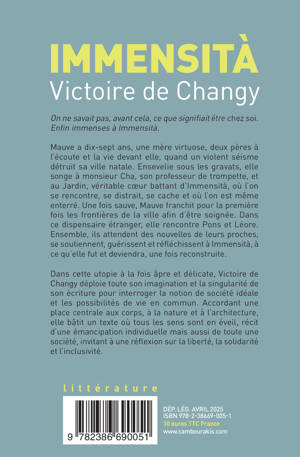 Mauve a dix-sept ans, une mère virtuose, deux pères à l'écoute et la vie devant elle, quand un violent séisme détruit sa ville natale. Ensevelie sous les gravats, elle songe à monsieur Cha, son professeur de trompette, et au Jardin, véritable coeur battant d'Immensità, où l'on se rencontre, se distrait, se cache et où l'on est même enterré. Une fois sauve, Mauve franchit pour la première fois les frontières de la ville afin d'être soignée. Dans ce dispensaire étranger, elle rencontre Pons et Léore. Ensemble, ils attendent des nouvelles de leurs proches, se soutiennent, guérissent et réfléchissent à Immensità, à ce qu'elle fut et deviendra, une fois reconstruite. Dans cette utopie à la fois âpre et délicate, Victoire de Changy déploie toute son imagination et la singularité de son écriture pour interroger la notion de société idéale et les possibilités de vie en commun. Accordant une place centrale aux corps, à la nature et à l'architecture, elle bâtit un texte où tous les sens sont en éveil, récit d'une émancipation individuelle mais aussi de toute une société, invitant à une réflexion sur la liberté, la solidarité et l'inclusivité.
