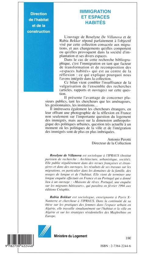 L'ouvrage de Roselyne De Villanova et de Rabia Bekkar répond parfaitement à L'objectif visé par cette collection consacrée aux migrations, et aux changements qu'elles comportent ou qu'elles provoquent dans la société d'implantation et ses divers espaces.