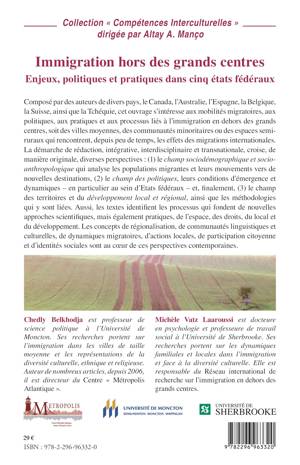 Cet ouvrage s'intéresse aux mobilités migratoires, aux politiques, aux pratiques et aux processus liés à l'immigration en dehors des grands centres, soit des villes moyennes, des communautés minoritaires ou des espaces semi-ruraux qui rencontrent les effets des migrations internationales. Les concepts de régionalisation, communautés linguistiques et culturelles, d'actions locales, de participations citoyennes sont au coeur de ces perspectives.