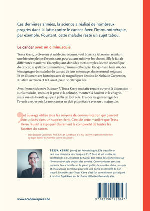 Tessa Kerre, professeur et médecin reconnu, veut briser ce tabou en racontant une histoire pleine d'espoir, sans pour autant enjoliver les choses. Elle le fait de différentes manières. En expliquant, dans des mots simples, le côté scientifique du cancer, le système immunitaire, l'immunothérapie. En ajoutant, bien sûr, des témoignages de malades du cancer, de leur entourage, du personnel soignant. Et en illustrant ces histoires avec de magnifiques dessins de Nathalie Carpentier, Kristien Aertssen et B. Carrot, pour ne citer qu'elles.