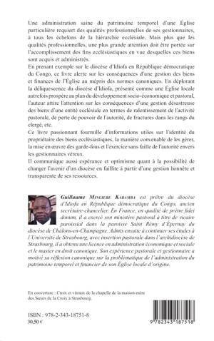 En prenant exemple sur le diocèse d'Idiofa en République démocratique du Congo, ce livre alerte sur les conséquences d'une gestion des biens et finances de l'Église au mépris des normes canoniques. En déplorant la déliquescence du diocèse d'Idiofa, présenté comme une Église locale autrefois prospère au plan du développement socio-économique et pastoral, l'auteur attire l'attention sur les conséquences d'une gestion désastreuse des biens d'une entité ecclésiale en termes de ralentissement de l'activité pastorale, de perte de pouvoir de l'autorité, de fractures dans les rangs du clergé.