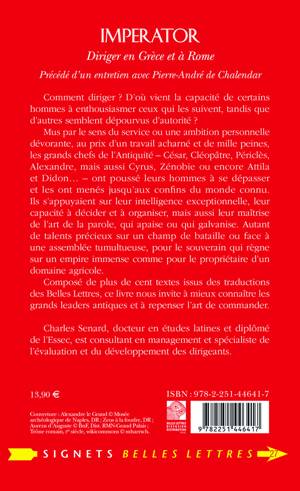 Comment diriger ? D'ou vient la capacite de certains hommes a enthousiasmer ceux qui les suivent, tandis que d'autres semblent depourvus d'autorite ? Mus par le sens du service ou une ambition personnelle devorante, au prix d'un travail acharne et de mille peines, les grands chefs de l'Antiquite - Cesar, Cleopatre, Pericles, Alexandre, mais aussi Cyrus, Zenobie ou encore Attila et Didon... - ont pousse leurs hommes a se depasser et les ont menes jusqu'aux confins du monde connu. Ils s'appuyaient sur leur intelligence exceptionnelle, leur capacite a decider et a organiser, mais aussi leur maitrise de l'art de la parole, qui apaise ou qui galvanise. Autant de talents precieux sur un champ de bataille ou face a une assemblee tumultueuse, pour le souverain qui regne sur un empire immense comme pour le proprietaire d'un domaine agricole. Compose de plus de cent textes issus des traductions des Belles Lettres, ce livre nous invite a mieux connaitre les grands leaders antiques et a repenser l'art de commander.