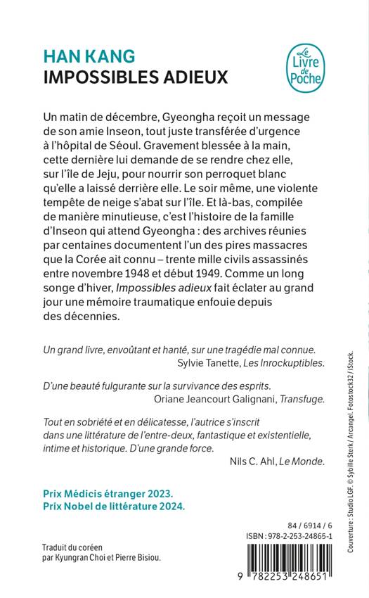 Le soir même, une violente tempête de neige s'abat sur l’île. Et là-bas, compilée de manière minutieuse, c’est l'histoire de la famille d'Inseon qui attend Gyeongha : des archives réunies par centaines documentent l'un des pires massacres que la Corée ait connu – trente mille civils assassinés entre novembre 1948 et début 1949. Comme un long songe d'hiver, Impossibles adieux fait éclater au grand jour une mémoire traumatique enfouie depuis des décennies.