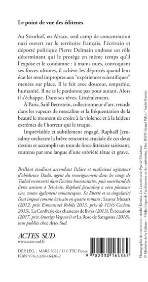 Au Struthof, en Alsace, seul camp de concentration nazi ouvert sur le territoire français, l'écrivain et déporté politique Pierre Delmain endosse un rôle déterminant qui le protège en même temps qu'il l'expose et le condamne : à mains nues, convoquant ses forces ultimes, il achève les déportés quand leur état les rend impropres aux "expériences scientifiques" menées sur place. Il le fait avec douceur, empathie, humanité. Il ne se le pardonne pas pour autant. Alors il s'échappe. Dans ses rêves. Littéralement. À Paris, Saül Bernstein, collectionneur d'art, retarde dans les vapeurs de mescaline et la fréquentation de la beauté le moment de croire à la violence et à la laideur extrêmes de l'horreur qui le traque. Imprévisible et subtilement engagé, Raphaël Jerusalmy orchestre la brève rencontre cruciale de ces deux destins et accomplit un tour de force littéraire saisissant, soutenu par une langue d'une sobriété têtue et grave.
