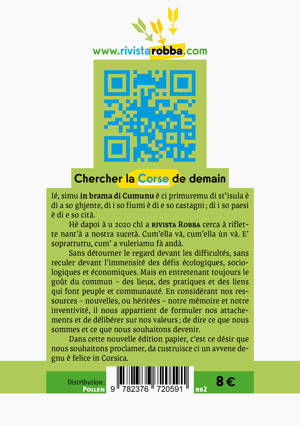 Ié, simu in brama di Cumunu è ci primuremu di st’isula è di a so ghjente, di i so fiumi è di e so castagni ; di i so paesi è di e so cità.Hè dapoi à u 2020 chì a rivista Robba cerca à riflette nant’à a nostra sucetà. Cum’ella và, cum’ella ùn và. E’ soprattuttu, cum’ a vuleriamu fà andà.Sans détourner le regard devant les difficultés, sans reculer devant l’immensité des défis écologiques, sociologiques et économiques. Mais en entretenant toujours le goût du commun – des lieux, des pratiques et des liens qui font peuple et communauté. En considérant nos ressources – nouvelles, ou héritées – notre mémoire et notre inventivité, il nous appartient de formuler nos attachements et de délibérer sur nos valeurs ; de dire ce que nous sommes et ce que nous souhaitons devenir.Dans cette nouvelle édition papier, c’est ce désir que nous souhaitons proclamer, da custruisce ci un avvene degnu è felice in Corsica.