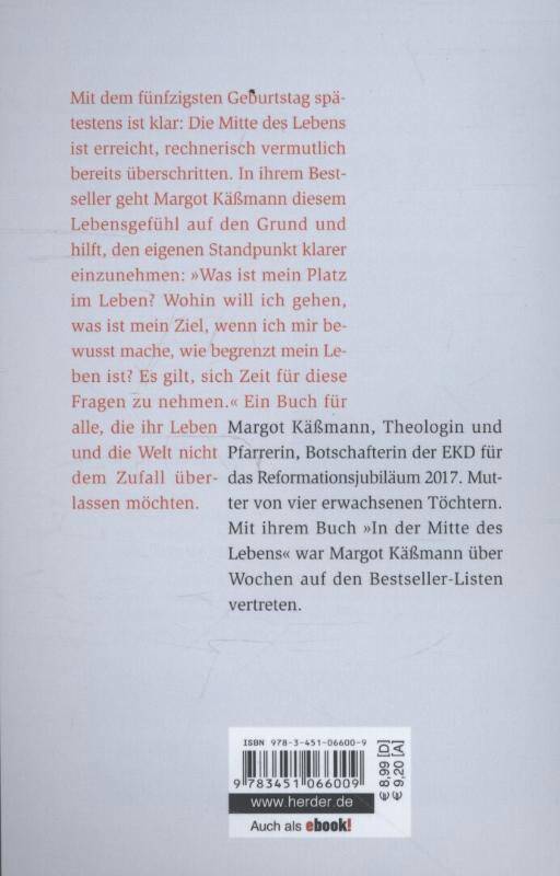50 - und definitiv zu alt für faule Kompromisse. Was war bis hierher? Und: Was habe ich noch vor? Margot Käßmanns Bestseller erzählt von den Themen, die sich jedem mitten im Leben stellen: Jugendlichkeit und Alter, Familie, Freundschaft und Alleinsein, Schönheit und Scheitern, Krankheit und Glück, Grenzen und Kraftquellen, Routine und Veränderung. Ein Buch, so lebendig wie jede wahre Geschichte, das hilft, den eigenen Standort klarer zu sehen.