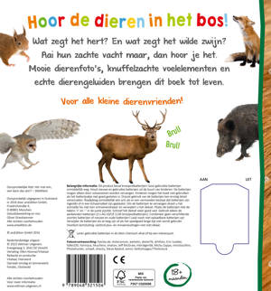 Wat zegt het hert? En wat zegt het wilde zwijn? Aai hun zachte vacht maar, dan hoor je het. Mooie dierenfoto’s, knuffelzachte voelelementen en echte dierengeluiden brengen dit boek tot leven.