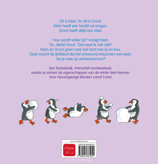 ‘Hoe wordt water ijs?’ vraagt Klein. Tja, denkt Groot. ‘Dat weet ik ook niet!’ Klein en Groot gaan naar het land van ijs en kou. Daar woont de Bollebof die het antwoord misschien wel weet. Ga je mee op winteravontuur?