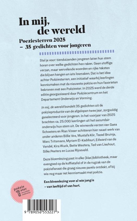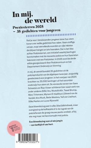 In mij, de wereld bundelt 35 gedichten uit de poëzieproductie van afgelopen twee jaar, zorgvuldig geselecteerd voor jongeren. In het voorjaar van 2025 brachten 25.000 leerlingen uit het secundair onderwijs hun stem uit. De winnende verzen van Gaea Schoeters en Rian Visser schitteren hier naast werk van onder anderen Billie Vos, Mustafa Kör, Tsead Bruinja, Marc Tritsmans, Myriem El-Kaddouri, Edward van de Vendel, Kira Wuck, Bette Westera, Ted van Lieshout, Silke Peeters en Lucas Rijneveld.