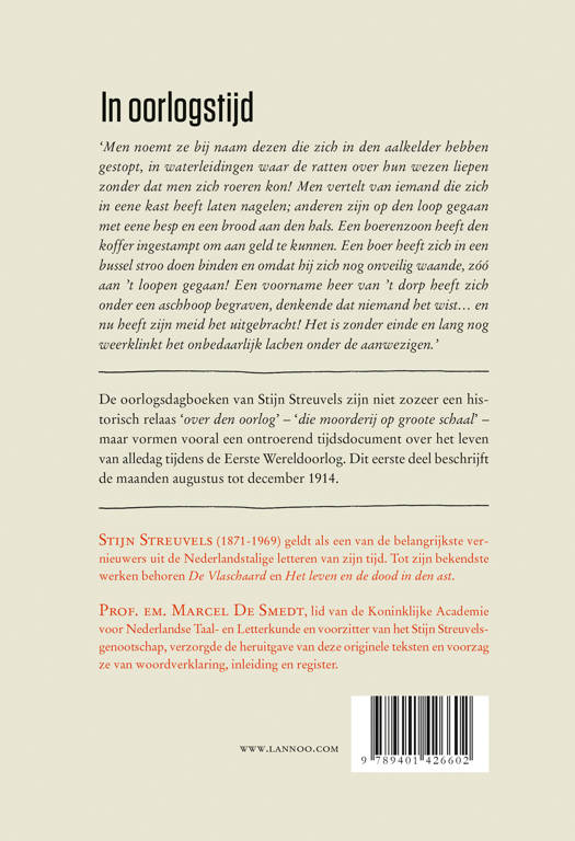 Het controversiële oorlogsdagboek van Stijn Streuvels heruitgegeven 'Men noemt ze bij naam dezen die zich in den aalkelder hebben gestopt, in waterleidingen waar de ratten over hun wezen liepen zonder dat men zich roeren kon! Men vertelt van iemand die zich in eene kast heeft laten nagelen; anderen zijn op den loop gegaan met eene hesp en een brood aan den hals. Een boerenzoon heeft den koffer ingestampt om aan geld te kunnen. Een boer heeft zich in een bussel stroo doen binden en omdat hij zich nog onveilig waande, zóó aan 't loopen gegaan! Een voorname heer van 't dorp heeft zich onder een aschhoop begraven, denkende dat niemand het wist... en nu heeft zijn meid het uitgebracht! Het is zonder einde en lang nog weerklinkt het onbedaarlijk lachen onder de aanwezigen.' De oorlogsdagboeken van Stijn Streuvels zijn niet zozeer een historisch relaas 'over den oorlog' – 'die moorderij op groote schaal' - maar vormen vooral een ontroerend tijdsdocument over het leven van alledag tijdens de Eerste Wereldoorlog. Dit eerste deel beschrijft de maanden augustus tot december 1914.