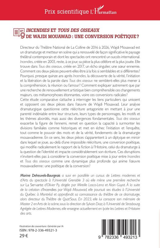 Directeur du Théâtre National de La Colline de 2016 à 2026, Wajdi Mouawad est un dramaturge et metteur en scène qui a renouvelé de façon significative le paysage théâtral contemporain et dont les spectacles ont rencontré un succès international. Incendies, créée en 2003, reste, à ce jour, sa pièce la plus célèbre et la plus jouée. Elle trouve dans Tous des oiseaux, créée en 2017, un écho singulier, une soeur ennemie. Comment ces deux pièces peuvent-elles être à la fois si semblables et si différentes ? Pourquoi, presque quinze ans après Incendies, la découverte de la vérité, l'initiation et la libération de la parole dans Tous des oiseaux ne semblent-elles plus mener à la compréhension, la réunion ou l'amour ? Comment expliquer autrement que par une recherche de renouvellement artistique bien compréhensible ces changements majeurs, ces métamorphoses étonnantes, voire ces conversions radicales ? Cette étude comparative s'attache à interroger les liens particuliers qui unissent et opposent ces deux pièces dans l'oeuvre de Wajdi Mouawad. Leur analyse dramaturgique questionne cette réécriture antagoniste en mettant à jour une parenté indéniable entre leur structure, leurs types de personnages, les motifs et les thèmes abordés, mais aussi des divergences fondamentales. Tous des oiseaux exacerbe la figure de l'ennemi, remet en question la capacité à surmonter les divisions familiales comme historiques et met en échec l'initiation et l'enquête, tout comme le pouvoir des mots et de la vérité, fondements de la dramaturgie mouawadienne. En ce sens, les deux pièces s'apparentent à un diptyque en miroir dans lequel se joue, au-delà d'une impossible réécriture, une conversion poétique, qui modifie radicalement le rapport de la fiction à l'Histoire, celui du dramaturge à la question de l'identité et impacte considérablement son écriture. Ces disruptions n'invitent-elles pas à considérer la conversion poétique mise à jour entre Incendies et Tous des oiseaux comme une dynamique plus profonde qui anime l'oeuvre mouawadienne une poétique de la conversion ?