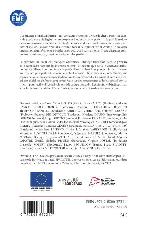 Cet ouvrage pluridisciplinaire porte sur la problématique des accompagnements et des accessibilités dans le cadre de l'inclusion scolaire, universitaire et sociale. Les contributions sélectionnées ont été présentées au cours d'un colloque international qui s'est tenu à Bordeaux en août 2019 sur ce thème. Treize chapitres composent ce volume, regroupés en trois grandes parties.