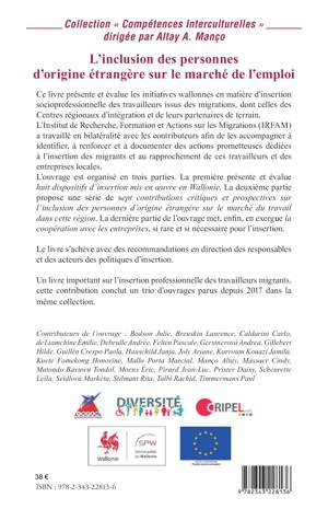 Ce livre présente et évalue les initiatives wallonnes en matière d'insertion socioprofessionnelle des travailleurs issus des migrations, dont celles des Centres régionaux d'intégration et de leurs partenaires de terrain. L'Institut de Recherche, Formation et Actions sur les Migrations (IRFAM) a travaillé en bilatéralité avec les contributeurs afin de les accompagner à identifier, à renforcer et à documenter des actions prometteuses dédiées à l'insertion des migrants et au rapprochement de ces travailleurs et des entreprises locales.