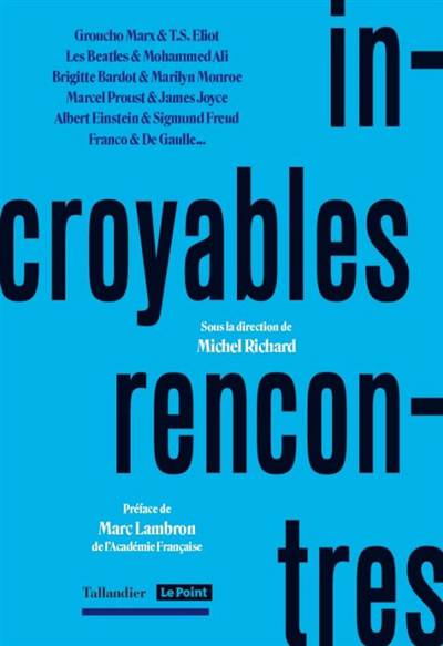 Un psychanalyste et un physicien, un austère Nobel et un amuseur public, un poète et un ethnologue, un dictateur et un héros, et combien d'autres duos, étonnants et détonants, qui n'auraient jamais dû se former si le hasard n'y avait mis sa patte en espiègle directeur de casting. Einstein et Freud : l'un méprise l'autre et l'autre jalouse le premier. Marilyn Monroe et Brigitte Bardot s'épient en concurrentes. Proust et Joyce s'ignorent ostensiblement. Mohammed Ali défie les Beatles. Le prince de Ligne vient piller les souvenirs coquins de Casanova. T. S. Eliot vexe Groucho Marx. André Breton et Claude Lévi-Strauss entament une relation au long cours... Incroyables rencontres où l'on voit nos couples de héros s'admirer, se bouder, s'aimer ou se disputer. Douze incroyables rencontres. Douze romans vrais.