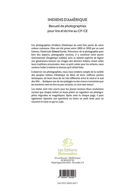 Ces photographies d’Indiens d’Amérique du Nord font partie de notre culture commune. Elles ont été prises entre 1900 et 1930 par un seul homme, l’Américain Edward Curtis. Précurseur de la photographie pour bien des aspects, photographe reconnu, il a constitué cette œuvre monumentale (longtemps oubliée) avec la volonté explicite de léguer aux générations futures ces images des derniers Indiens vivant selon leurs traditions ancestrales. Avec ce petit cahier pour les enfants, nous voulons l’aider à réaliser la mission qu’il s’était fixée.