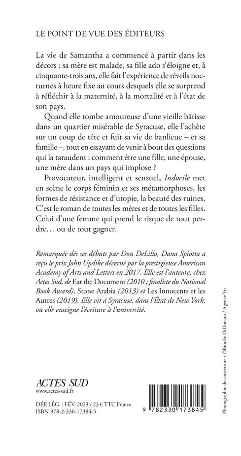 La vie de Samantha a commencé à partir dans les décors : sa mère est malade, sa fille ado s'éloigne et, à cinquante-trois ans, elle fait l'expérience de réveils nocturnes à heure fixe au cours desquels elle se surprend à réfléchir à la maternité, à la mortalité et à l'état de son pays. Quand elle tombe amoureuse d'une vieille bâtisse dans un quartier misérable de Syracuse, elle l'achète sur un coup de tête et fuit sa vie de banlieue - et sa famille -, tout en essayant de venir à bout des questions qui la taraudent : comment être une fille, une épouse, une mère dans un pays qui implose ? Provocateur, intelligent et sensuel, Indocile met en scène le corps féminin et ses métamorphoses, les formes de résistance et d'utopie, la beauté des ruines. C'est le roman de toutes les mères et de toutes les filles. Celui d'une femme qui prend le risque de tout perdre... ou de tout gagner.