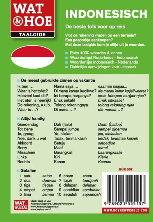 Wat & Hoe Taalgids Indonesisch is de beste tolk voor op reis. Met ruim 4.000 woorden en zinnen kom je altijd uit je woorden. Vlot de rekening vragen? Een gesprekje aanknopen? Met deze taalgids lukt het allemaal.