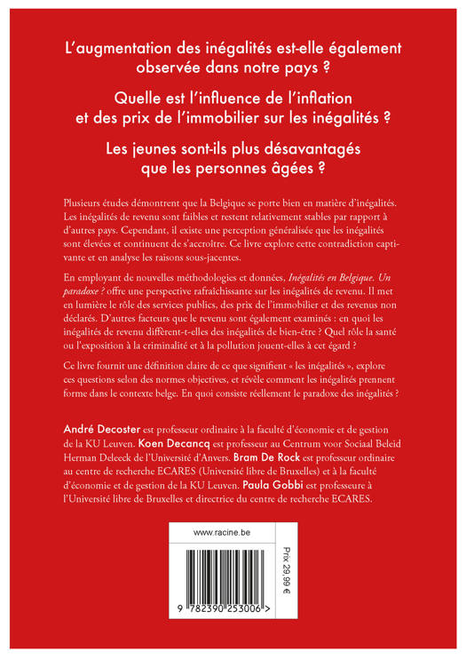 En employant de nouvelles méthodologies et données, Inégalités en Belgique. Un paradoxe ? offre une perspective rafraîchissante sur les inégalités de revenu. Il met en lumière le rôle des services publics, des prix de l'immobilier et des revenus non déclarés. D'autres facteurs que le revenu sont également examinés : en quoi les inégalités de revenu diffèrent-t-elles des inégalités de bien-être ? Quel rôle la santé ou l'exposition à la criminalité et à la pollution jouent-elles à cet égard ?