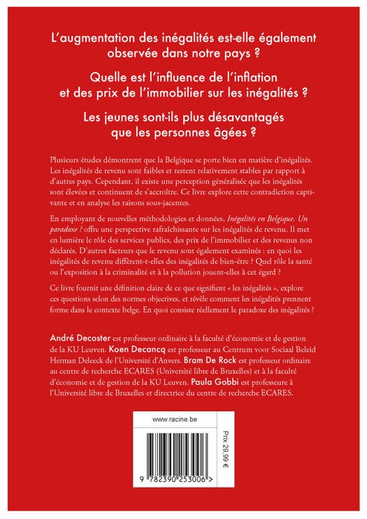 L'augmentation des inégalités est-elle également observée dans notre pays ? Quelle est l'influence de l'inflation et des prix de l'immobilier sur les inégalités ? Les jeunes sont-ils plus désavantagés que les personnes âgées ? Plusieurs études démontrent que la Belgique se porte bien en matière d'inégalités. Les inégalités de revenu sont faibles et restent relativement stables par rapport à d'autres pays. Cependant, il existe une perception généralisée que les inégalités sont élevées et continuent de s'accroître. Ce livre explore cette contradiction captivante et en analyse les raisons sous-jacentes. En employant de nouvelles méthodologies et données, Inégalités en Belgique. Un paradoxe ? offre une perspective rafraîchissante sur les inégalités de revenu. Il met en lumière le rôle des services publics, des prix de l'immobilier et des revenus non déclarés. D'autres facteurs que le revenu sont également examinés : en quoi les inégalités de revenu diffèrent-t-elles des inégalités de bien-être ? Quel rôle la santé ou l'exposition à la criminalité et à la pollution jouent-elles à cet égard ? Ce livre fournit une définition claire de ce que signifient « les inégalités », explore ces questions selon des normes objectives, et révèle comment les inégalités prennent forme dans le contexte belge. En quoi consiste réellement le paradoxe des inégalités ? Avec des contributions de Ella-Marie Assal, Bart Capéau, Micael Castanheira, Laurens Cherchye, Gerard Domènech-Arumí, Sarah Kuypers, Giovanni Paolo Mariani, Sakura Panagamuwa Gamage, Erik Schokkaert, Stijn Van Houtven, Jonas Vanderkelen, Gerlinde Verbist, Frederic Vermeulen, Kobe Wolfs
