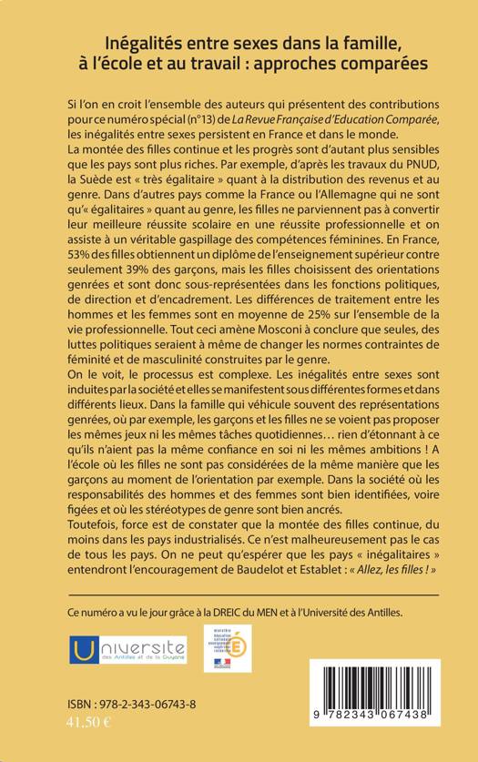 La montée des filles continue et les progrès sont d'autant plus sensibles que les pays sont plus riches. Si la Suède est très égalitaire quant à la discrimination des revenus et au genre, la France et l'Allemagne ne sont pas "égalitaires" quant au genre, les filles ne parvenant pas à convertir leur meilleure réussite scolaire en une réussite professionnelle. En France, les filles choisissent des orientations genrées, donc sous-représentées dans les fonctions politiques de direction et d'encadrement. Le processus est complexe. Ce numéro l'interroge sous de multiples aspects.