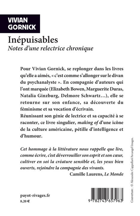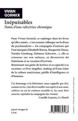 Dans "Inépuisables", Vivian Gornick revient sur les auteurs qui ont marqué sa vie, lus et relus à différentes périodes. L'occasion pour elle de combiner son génie de lectrice et sa capacité à se raconter. C'est la première fois que le public français pourra apprécier un de ses talents majeurs, la critique littéraire, après avoir plébiscité son travail autobiographique. A ses côtés, on arpente sa bibliothèque intime - Colette, Duras, Doris Lessing, etc. - et, en pointillés, son existence. Un livre singulier, qui pétille d'intelligence et d'humour.