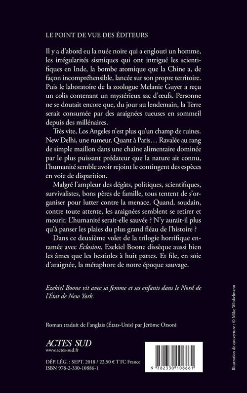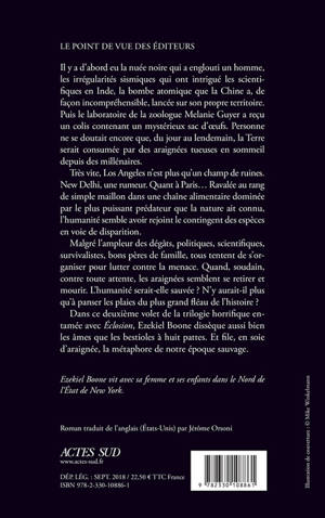 Dans ce deuxième volet de la trilogie horrifique entamée avec «Éclosion», Ezekiel Boone dissèque aussi bien les âmes que les bestioles à huit pattes. Et file, en soie d'araignée, la métaphore de notre époque sauvage.