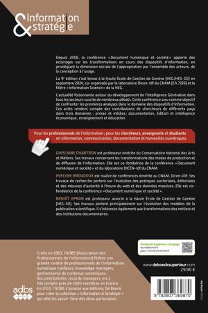 L’actualité foisonnante autour du développement de l’Intelligence Générative dans tous les secteurs suscite de nombreux débats. Cette conférence a eu comme objectif de confronter les premières analyses dans le domaine des dispositifs d’information. Ces actes rendent compte des contributions de chercheurs de différents pays dans trois domaines : presse et médias ; documentation, édition et intelligence économique ; enseignement et éducation.