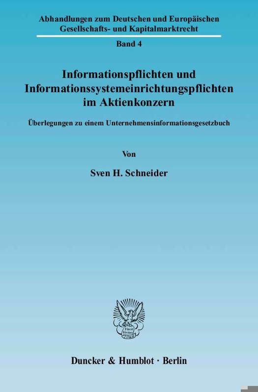 Diese informationellen Pflichten stammen aus unterschiedlichen Rechtsgebieten und stehen ungeordnet nebeneinander. Ziel muss es sein, diese in einer "Informationsordnung für Unternehmen" zusammenzufassen. Sven Schneider unterscheidet zu diesem Zweck zwischen Informationspflichten und Informationssystemeinrichtungspflichten und beschreibt beide für Einzelgesellschaft und Konzern. Differenziert wird dabei jeweils nach Informationen bzw. Informationssystemen für und über ein Unternehmen. Diese Einteilungen bilden kein Über- und Unterordnungsverhältnis, sondern stehen gleichberechtigt nebeneinander. Dadurch entsteht eine mehrdimensionale Matrix der verschiedenen Informationsarten. Der Autor zeigt die Unterschiede und Zusammenhänge zwischen den Bereichen auf und versucht, diese unter Berücksichtigung des amerikanischen Rechts und der aktuellen Corporate Governance Diskussion harmonisch aufeinander abzustimmen.