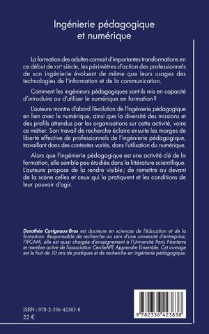 La formation des adultes connait d'importantes transformations en ce début de XXIe siècle, les périmètres d'action des professionnels de son ingénierie évoluent de même que leurs usages des technologies de l'information et de la communication. Comment les ingénieurs pédagogiques sont-ils mis en capacité d'introduire ou d'utiliser le numérique en formation ? L'auteure montre d'abord l'évolution de l'ingénierie pédagogique en lien avec le numérique, ainsi que la diversité des missions et des profils attendus par les organisations sur cette activité, voire ce métier. Son travail de recherche éclaire ensuite les marges de liberté effective de professionnels de l'ingénierie pédagogique, travaillant dans des contextes variés, dans l'utilisation du numérique. Alors que l'ingénierie pédagogique est une activité clé de la formation, elle semble peu étudiée dans la littérature scientifique. L'auteure propose de la rendre visible; de remettre au devant de la scène celles et ceux qui la pratiquent et les conditions de leur pouvoir d'agir.