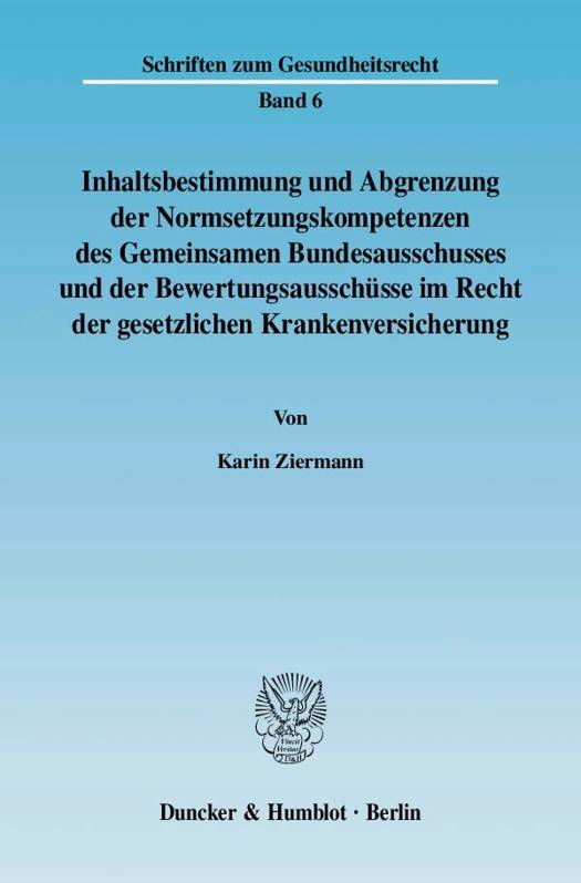 Im Recht der gesetzlichen Krankenversicherung haben kollegiale Funktionsträger seit langem erhebliches Gewicht bei der Normsetzung zur Wahrnehmung von Aufgaben der Selbstverwaltung. Der Gemeinsame Bundesausschuss und die Bewertungsausschüsse sind als Gremien der gemeinsamen Selbstverwaltung dazu beauftragt, Art, Umfang und Inhalt der vertrags(zahn)ärztlichen Versorgung näher zu bestimmen. Der Gesetzgeber hat dem Gemeinsamen Bundesausschuss und den Bewertungsausschüssen für die vertragsärztliche und die vertragszahnärztliche Versorgung Handlungsaufträge erteilt, aus deren Sachzusammenhang sich notwendigerweise ein enges Zusammenspiel der Richtlinien des Gemeinsamen Bundesausschusses und des Bewertungsmaßstabes ergibt. Erhebliches Konfliktpotenzial entsteht, wenn beide Gremien durch ihre Beschlüsse Konkretisierungen des Leistungsanspruches des Versicherten vornehmen. Karin Ziermann nimmt eine Abgrenzung der Normsetzungskompetenzen vor und zeigt innovative Lösungsmöglichkeiten zur Harmonisierung und Effizienzerhöhung der Aufgabenerfüllung beider Gremien auf.